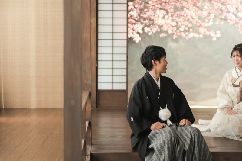 - まず新郎様の紋付袴の紹介からします! こちらの着物はスタンダードの商品で、袴はスタンダードの袴ではなくグレードアップの商品になっております! どちらかをグレードアップするだけで印象ががらっと変わります!♪