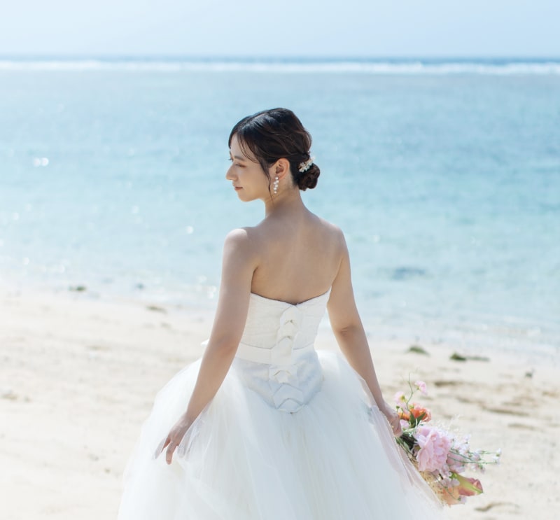 最後は編みおろしスタイル 今回新婦様から髪飾りにお花をつけたいとのご要望をいただき造花のお花を沢山装飾しました! 海にも色味が映えたスタイルに♪