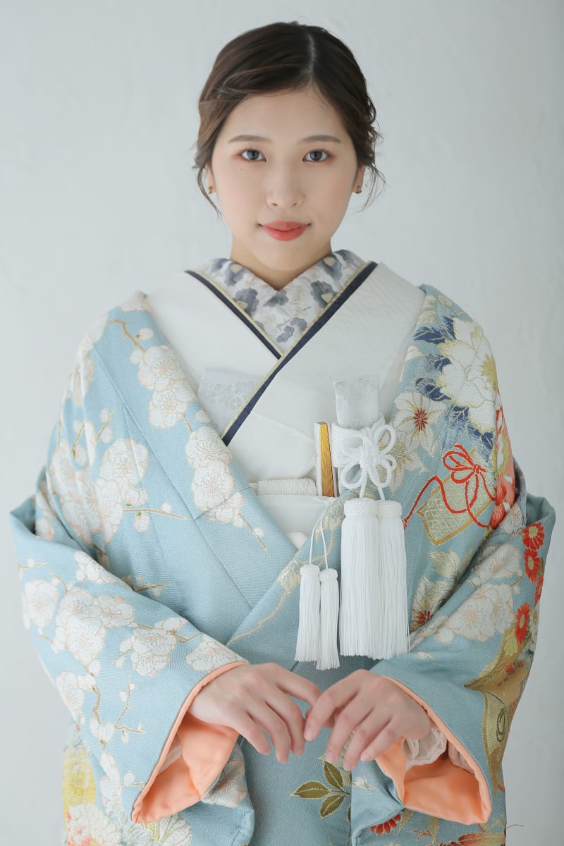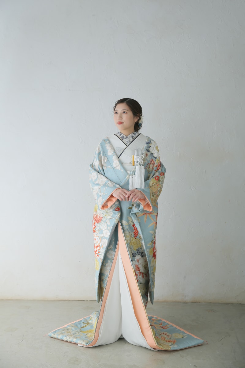 水色の生地にに、白やピンクの色の柄の入った打掛です♪