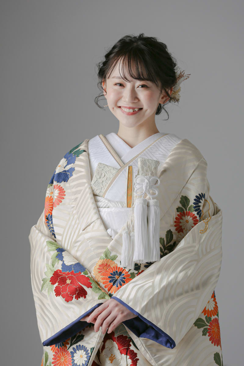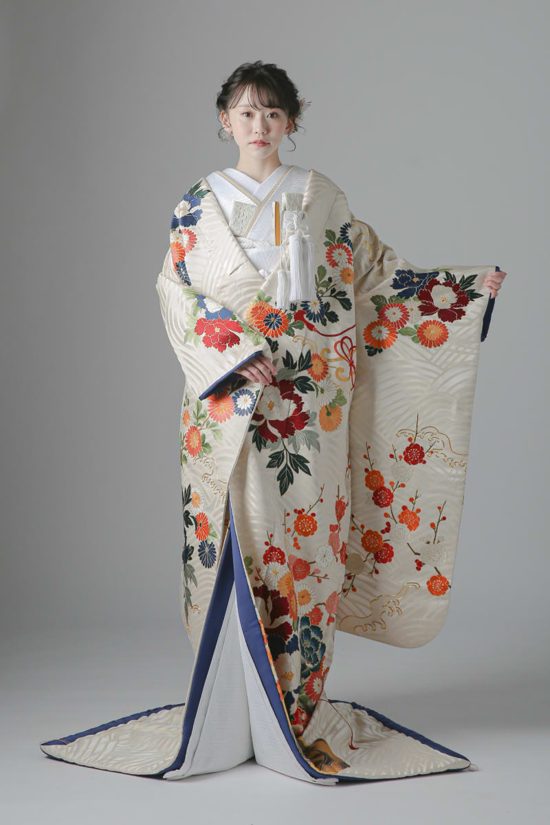 最後は、クリームカラーの生地に裏地の紺色がとっても映える大人っぽく落ち着きのある打掛です!