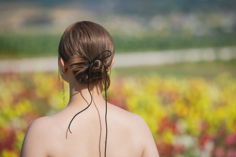 新婦様の明るい髪色に映えるように髪飾りは黒の細めリボンでカジュアルに^^