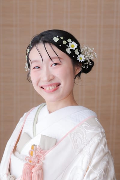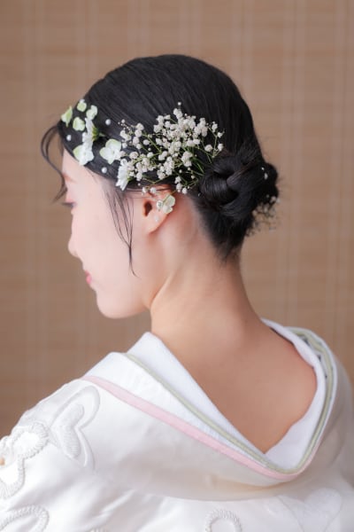 ヘアはかすみ草とマーガレットの生花を使い、ナチュラルだけどほんのり印象に残るように顔周りまでお花を散らしてます.˖٭