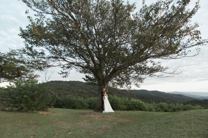 大きな木の下で新郎様にハグをしてもらいました! 景色の中に白ドレスが目立っていました!