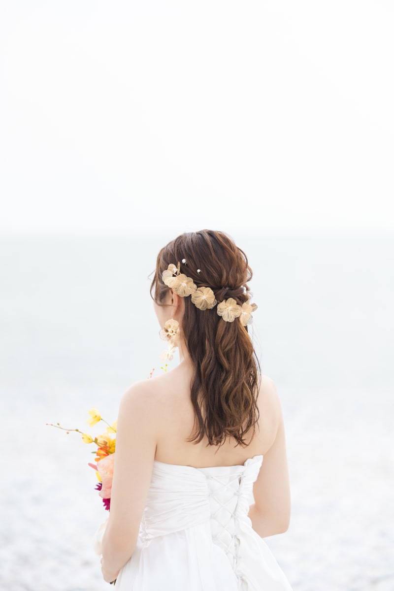 新婦様のヘアスタイルはハーフアップでカジュアルなイメージで海ともよくあっています♪