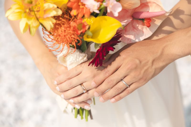 ブーケで顔を隠した可愛いショットやお二人の指輪のショットも!!♡