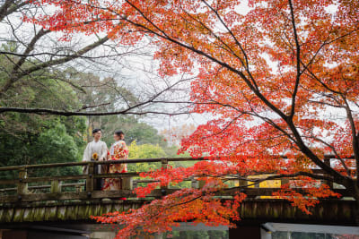 新郎様の淡いベージュの羽織と黒の袴は、華やかな紅葉と新婦様の衣装を優しく引き立てています。お二人が並ぶことで、伝統的かつ洗練された美しさが生まれています。
