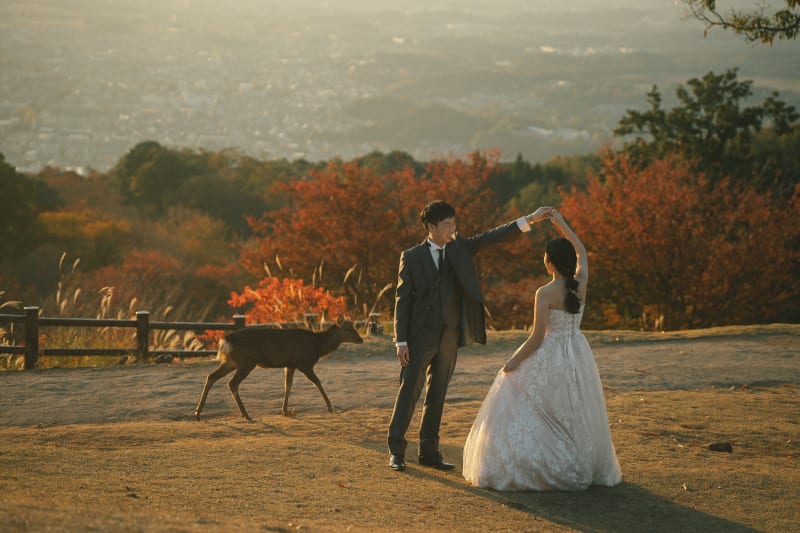若草山山頂は、視界を遮るものがほとんどないため、空と光の移り変わりをすべて見渡せます。夕日が沈む瞬間、空全体が茜色、オレンジ、紫色のグラデーションに染まる壮大な景色は、まさに天然の照明。この光の中で、お二人の姿は幻想的に浮かび上がります。