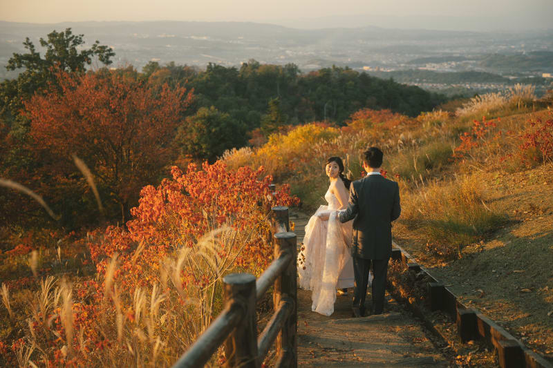 中でも最もドラマティックな瞬間は、山頂から眺める夕陽。今回は、若草山のサンセットタイムを最大限に活かした、洋装フォトウェディングの魅力をご紹介します。