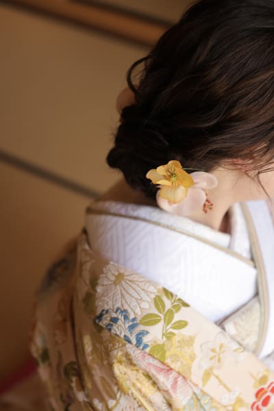 メイクや髪飾りも着物と合わせて、淡いピンクやイエローを入れ統一感を出しました♪