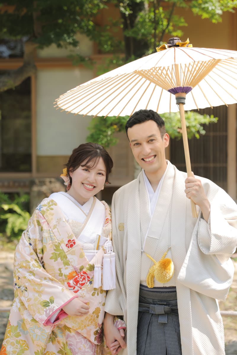 新郎様もベージュの紋服でより明るい印象に。