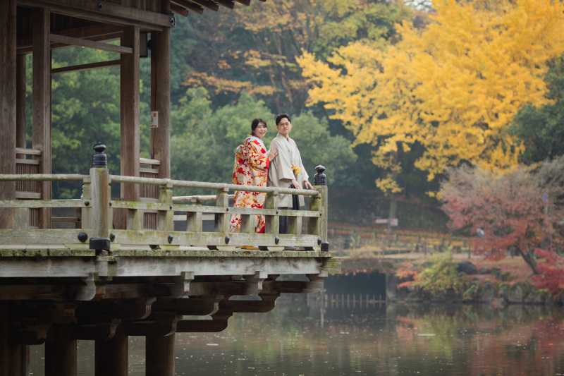 鷺池に浮かぶように建つ風情あるお堂の浮見堂は、水面に映る姿も美しく、幻想的な雰囲気を醸し出します。特に桜や紅葉の名所なので和装撮影にはぴったりのスポットです。夕暮れ時は、水面に反射する夕日がロマンチックな一枚を演出してくれます。