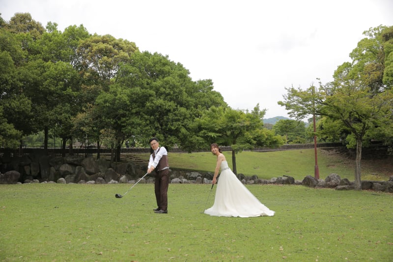 芝生の上では、お二人の趣味を反映したゴルフのポーズも取り入れました。新婦様がウェディングドレスでゴルフクラブを構える姿は、楽しさとユーモアにあふれていますね!