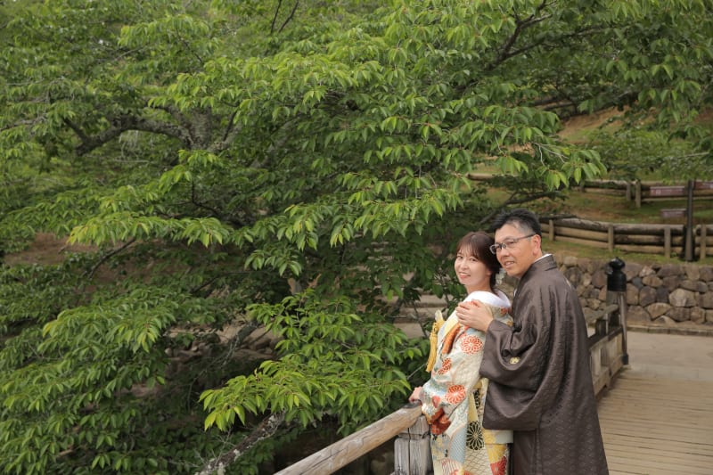 奈良公園の象徴である浮見堂に架かる橋の上や、水辺のほとりなど、日本らしい情緒あふれる風景。お二人の幸せな笑顔と相まって奥行きのある美しい一枚となりました。