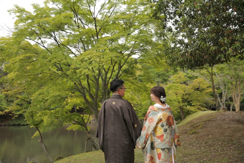 和装での厳かな美しさ、洋装での明るいロマンティックさ、そしてご家族の温かい笑顔。バリエーション豊かなロケーションフォトが完成しました!