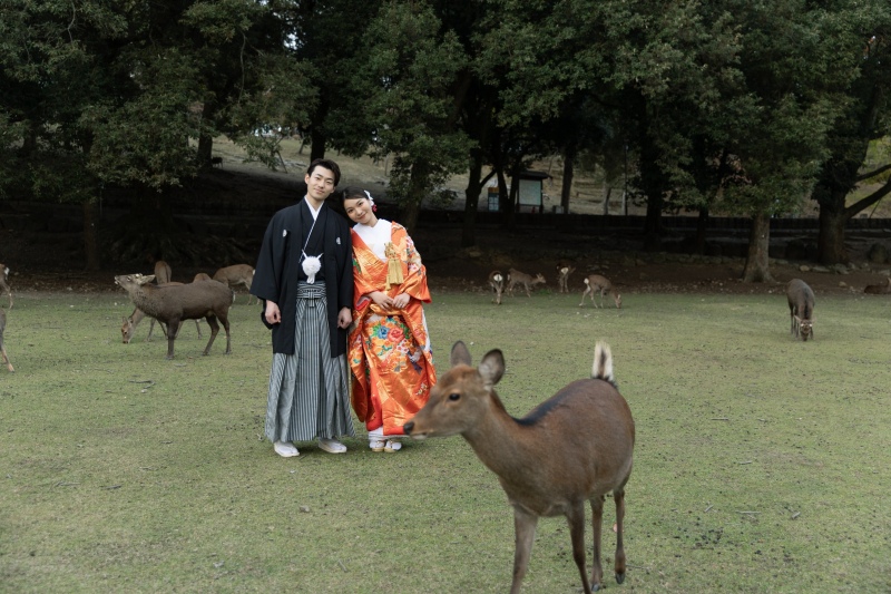 奈良を一望できる若草山で、夕陽や鹿とのショットも