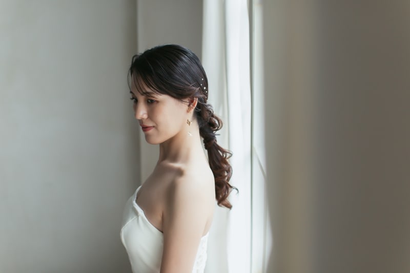 シンプルなウェディングドレスに合わせて、ヘアスタイルはタイトにまとめたポニーテール。