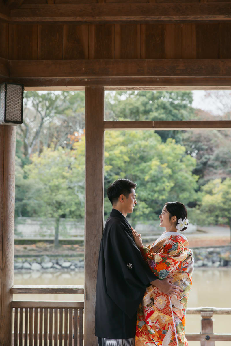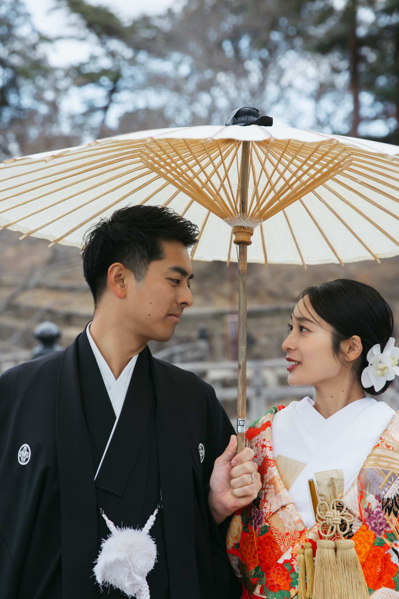 かっちりとした和装の中にも、おふたりらしい自然体な雰囲気が表れています。
