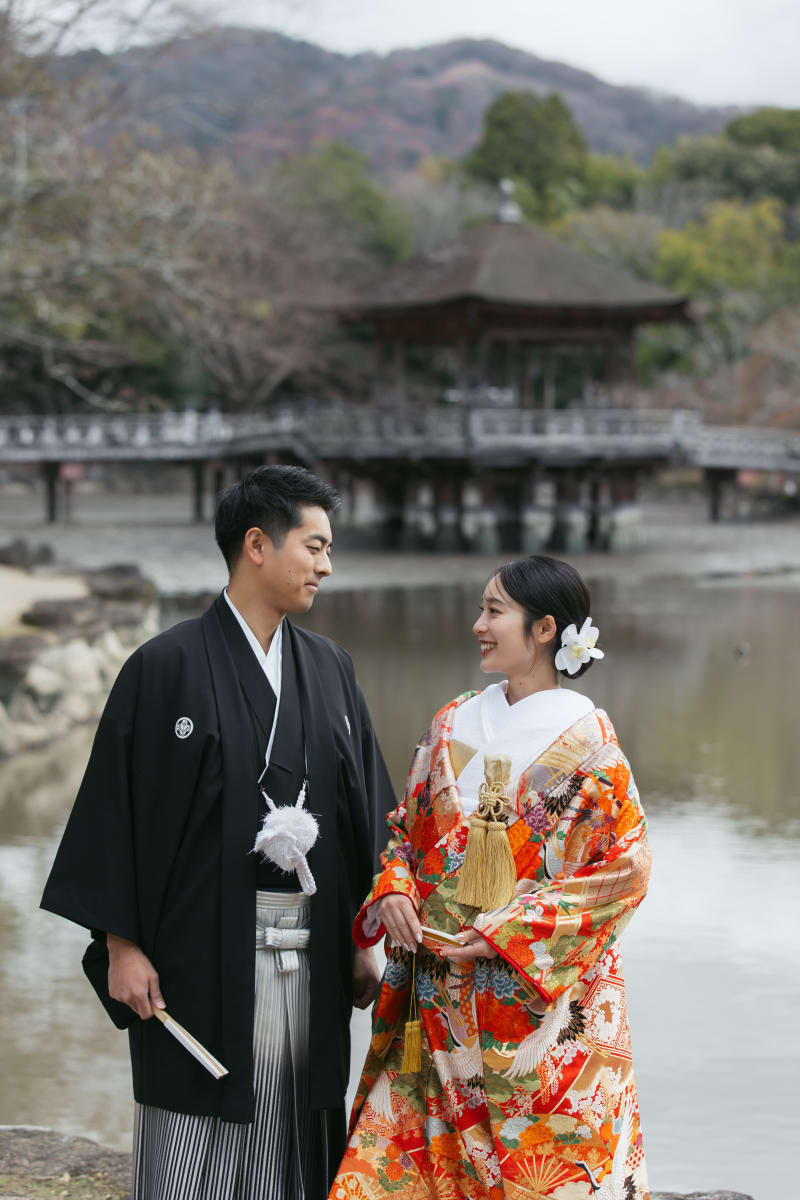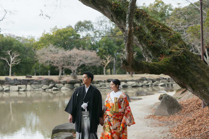 穏やかな池のほとりで向かい合うお二人の姿が、とても印象的な一枚です。