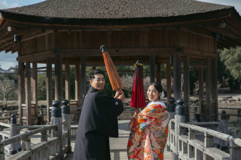 番傘を掲げ、振り返った瞬間にこぼれたおふたりの笑顔。