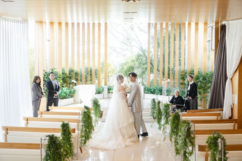 自然光が入る明るい空間が特徴です。チャペルの壁はガラス張りになっており、外の庭や緑の景色を見ることができるため、開放感のある雰囲気になっています。