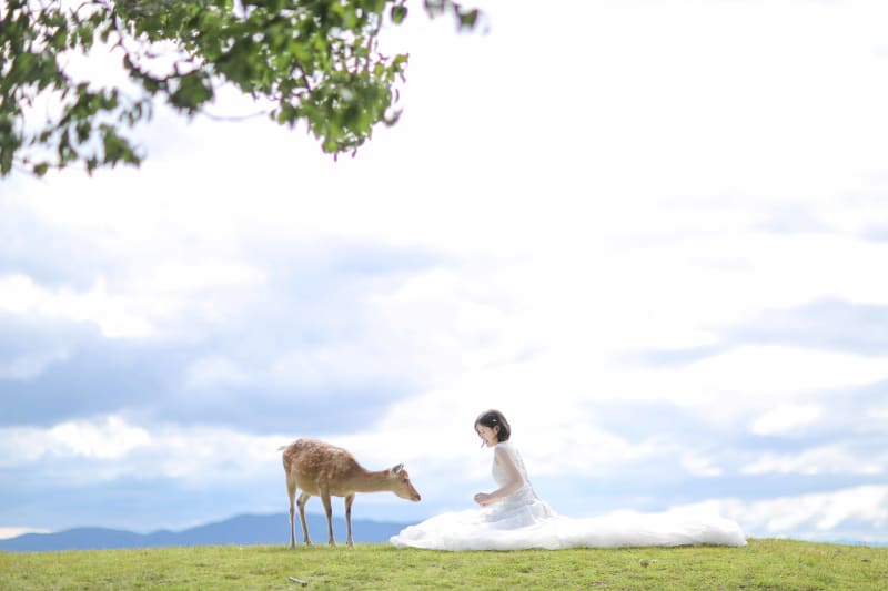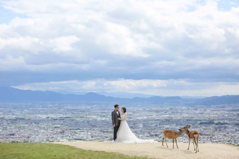 奈良を一望できる若草山で、夕陽や鹿とのショットも