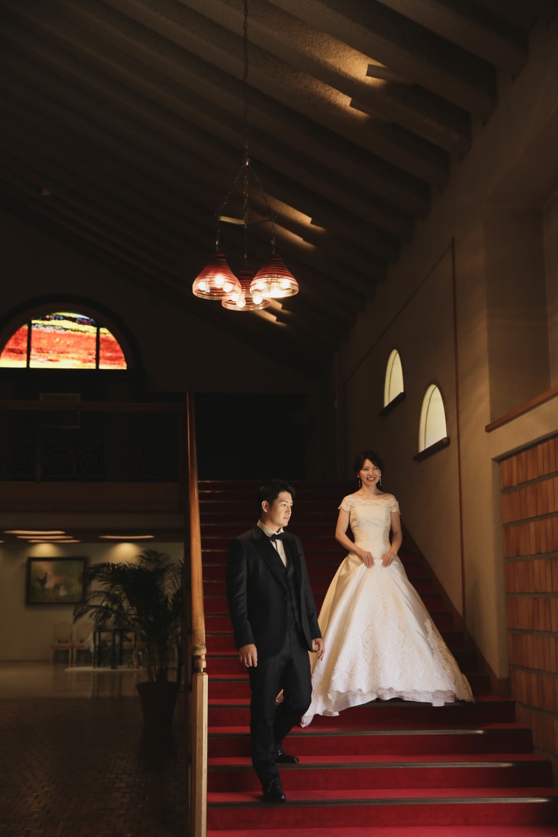 落ち着いた空間の中、タキシードとドレスも全体的に映るショットも撮ることができます。