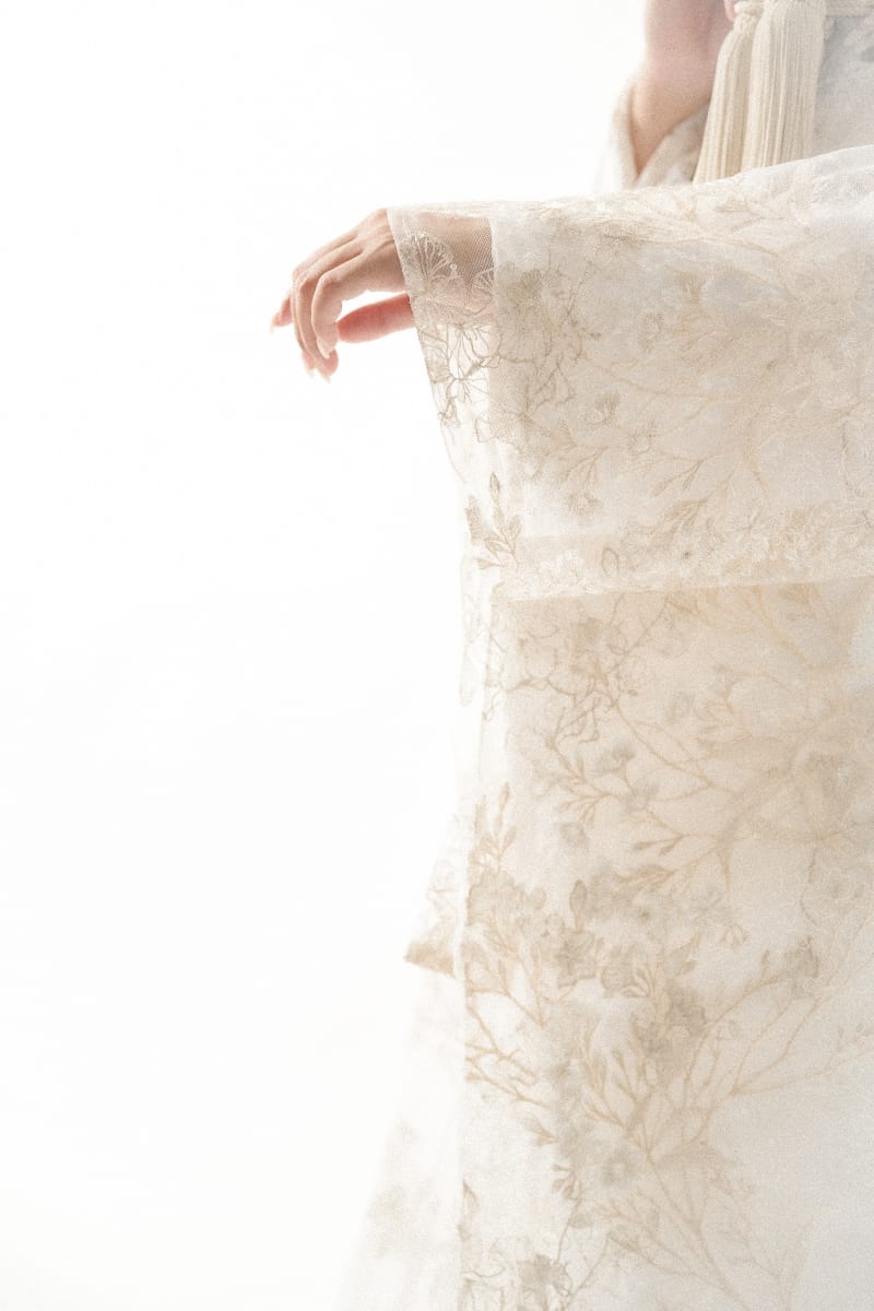 生地はレース生地に金糸でデザインを施しており、繊細かつナチュラルな仕上がりになっております。
