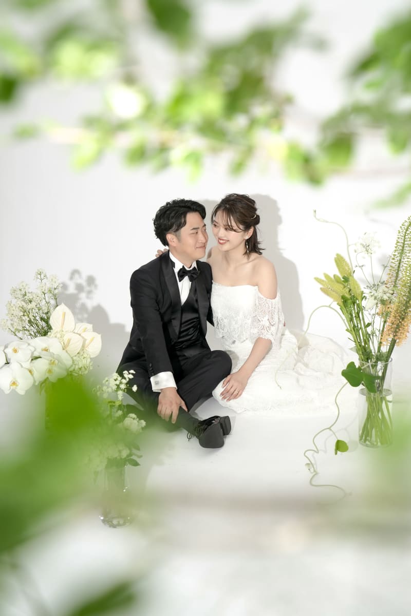背景がシンプルだからこそ、おふたりのお好きなアイテムが映えるスタジオPLUS。