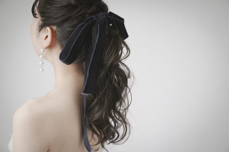 襟足すっきりにリボンのたれを長めに残して。ベロアリボンの存在感もでますね☺︎