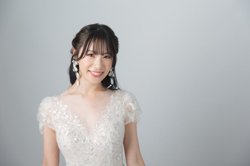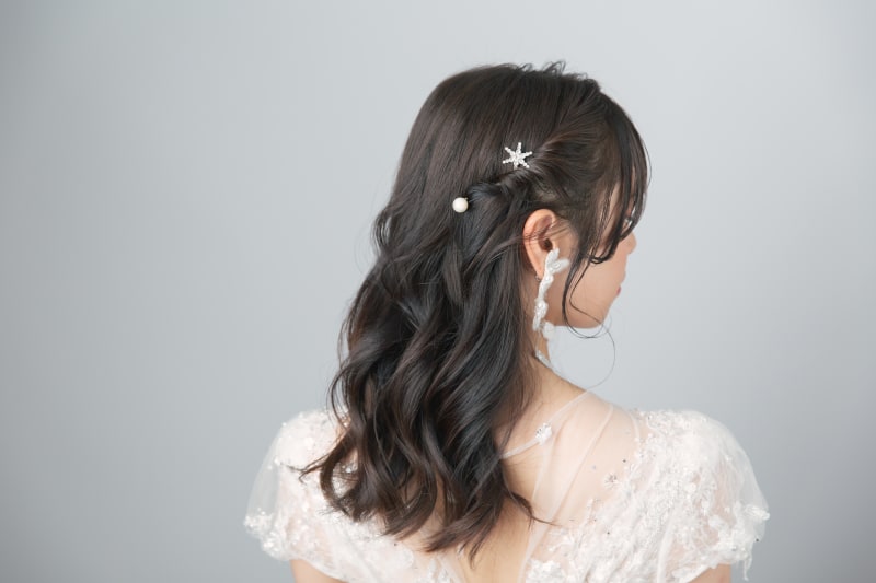 ヘアスタイルはゆるふわハーフツインです♪ ヘッドアクセはドレスに合った小ぶりのピンを使用しています🫧