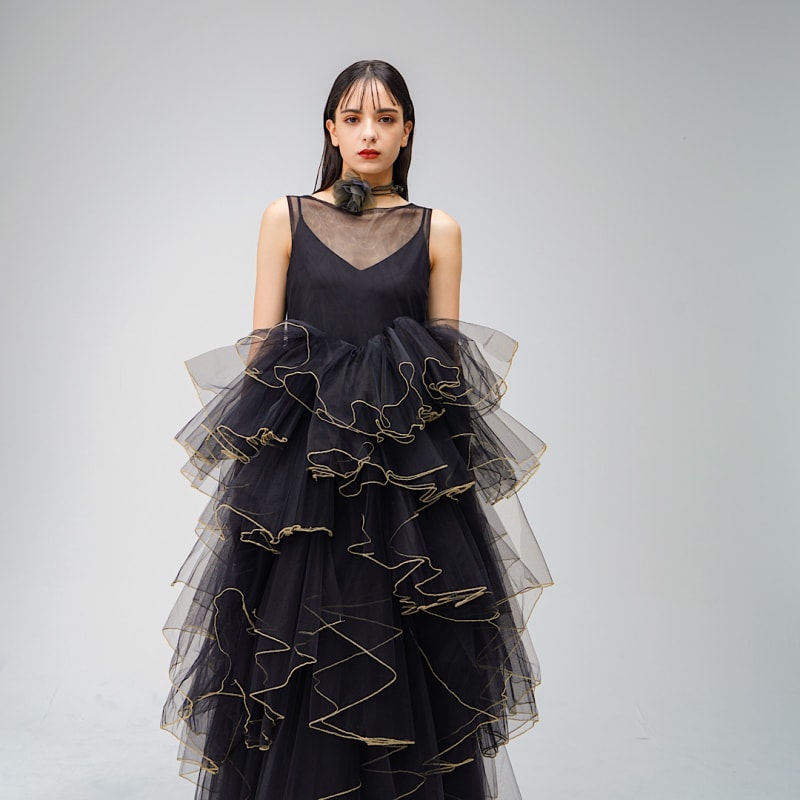 張り感のあるチュール生地はたくさんのギャザーを寄せることで動くたびに宙を舞うように揺れてくれます🫧🖤