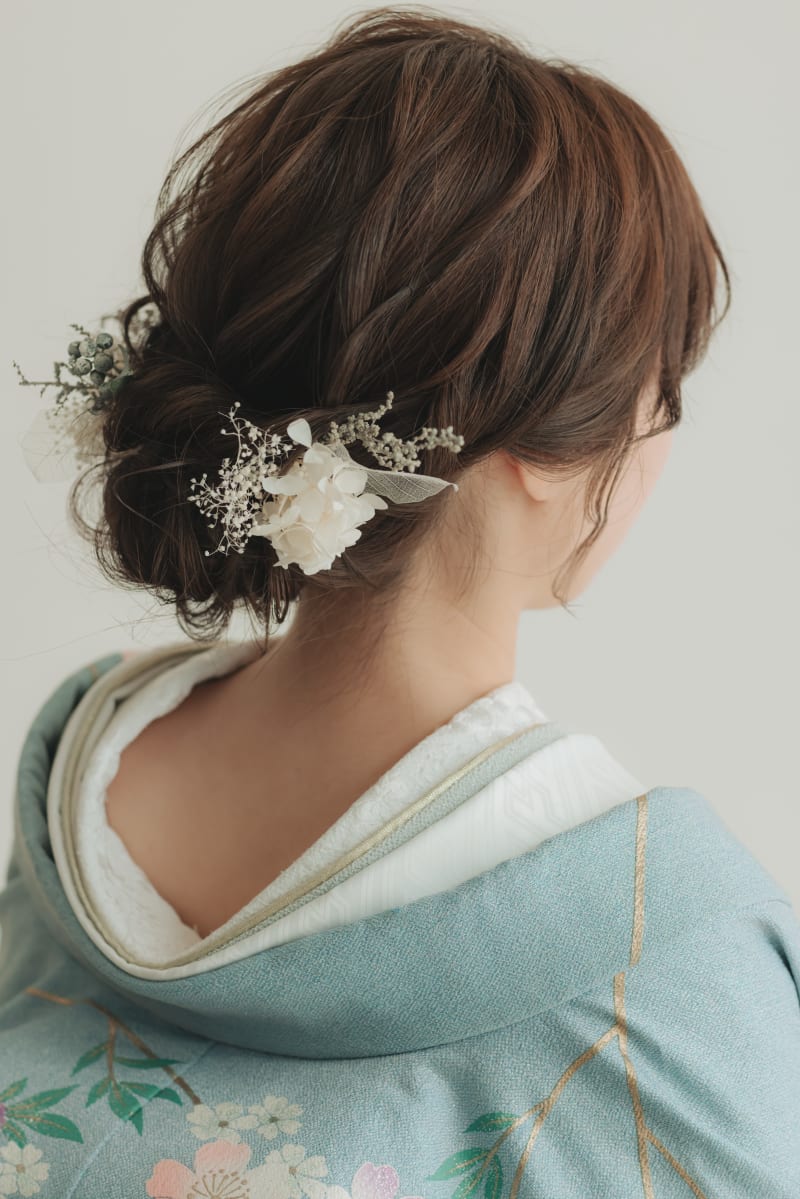 髪飾りにはドライフラワーをおつけしました。