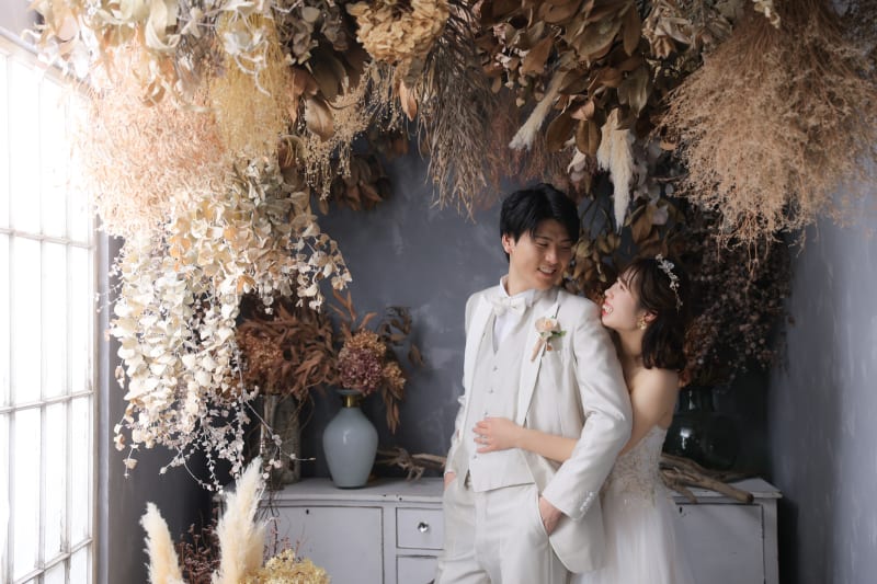 ドライフラワーに囲まれる背景では窓からの光でとても明るくなります!