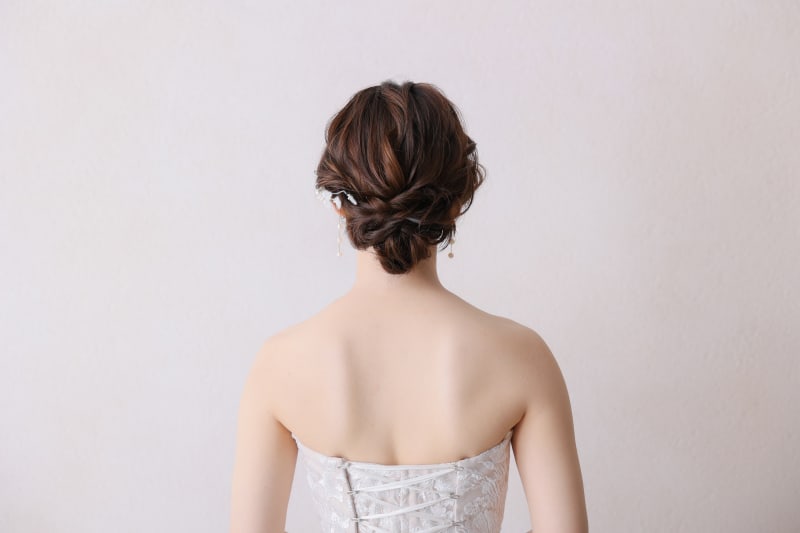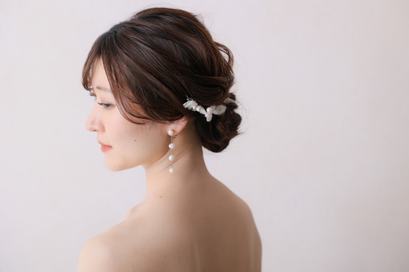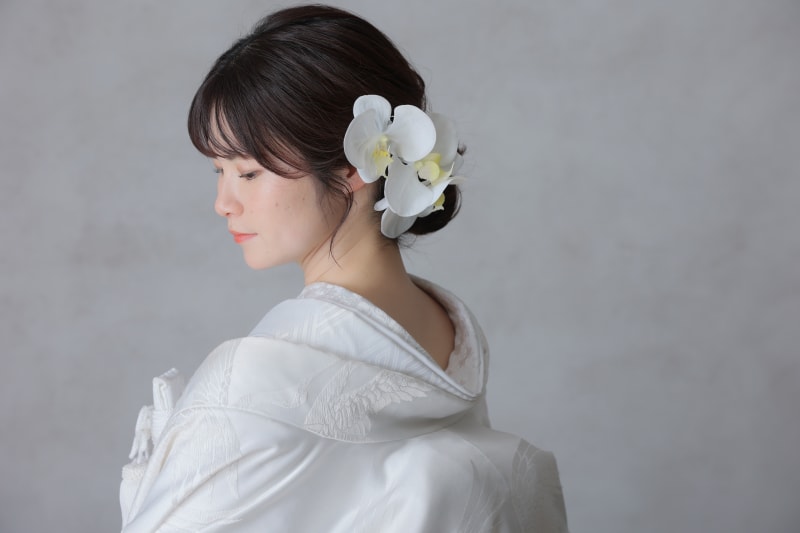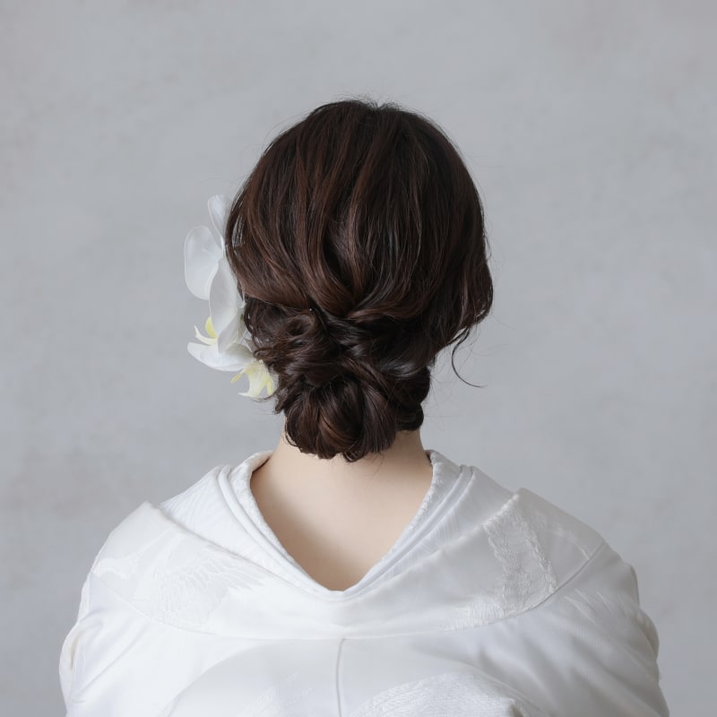 ツヤっとしたかっちりシニヨンもドライフラワーや金箔をつけると柔らかい印象になりますね!