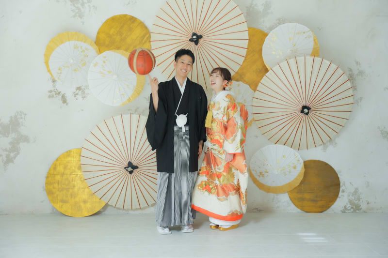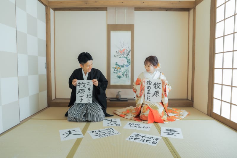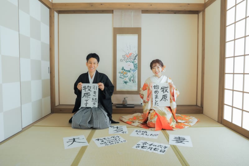 和装にちなんで、習字で結婚記念日や思いの丈を描いた和紙をお持ち込みいただき、撮影させていただきました。