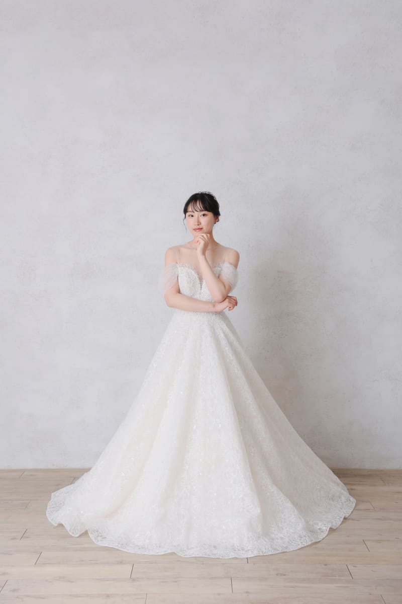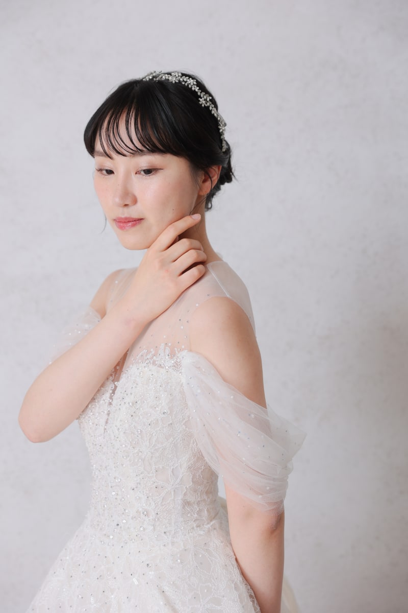 ラメのきらめき、また肩にチュールが一枚覆うことでお肌を明るく見せる効果もあります♪