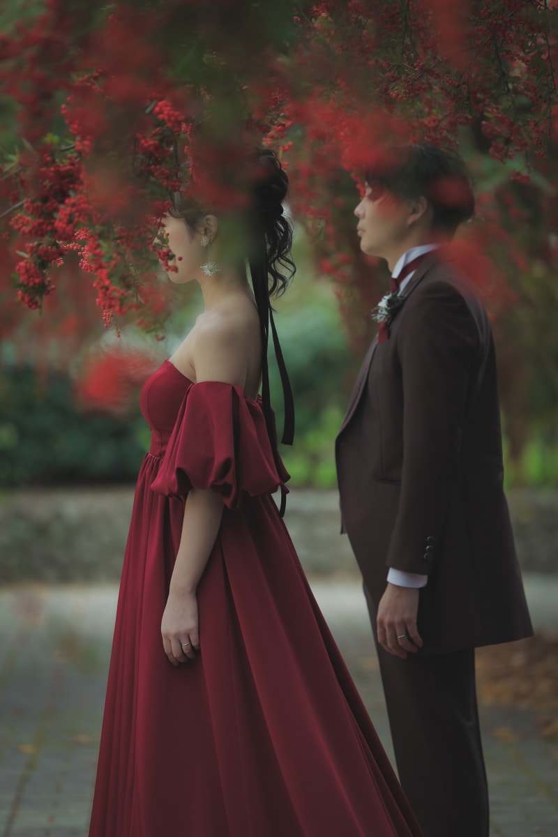 新郎様のネクタイと新婦様のドレスの赤色がさんざしの実と合っており