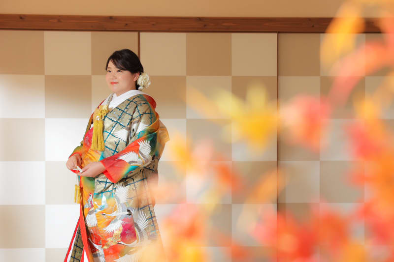 紅葉の猪目窓は背景に、和装ならではの正座姿。