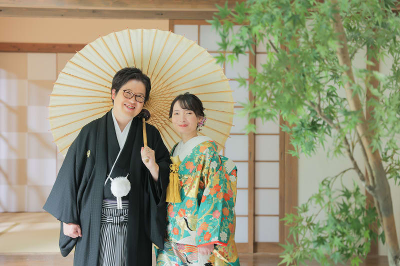縁側を背にお庭で和傘を持ったり、梅の絵が描かれている背景などもありシンプルなお写真も撮れます!