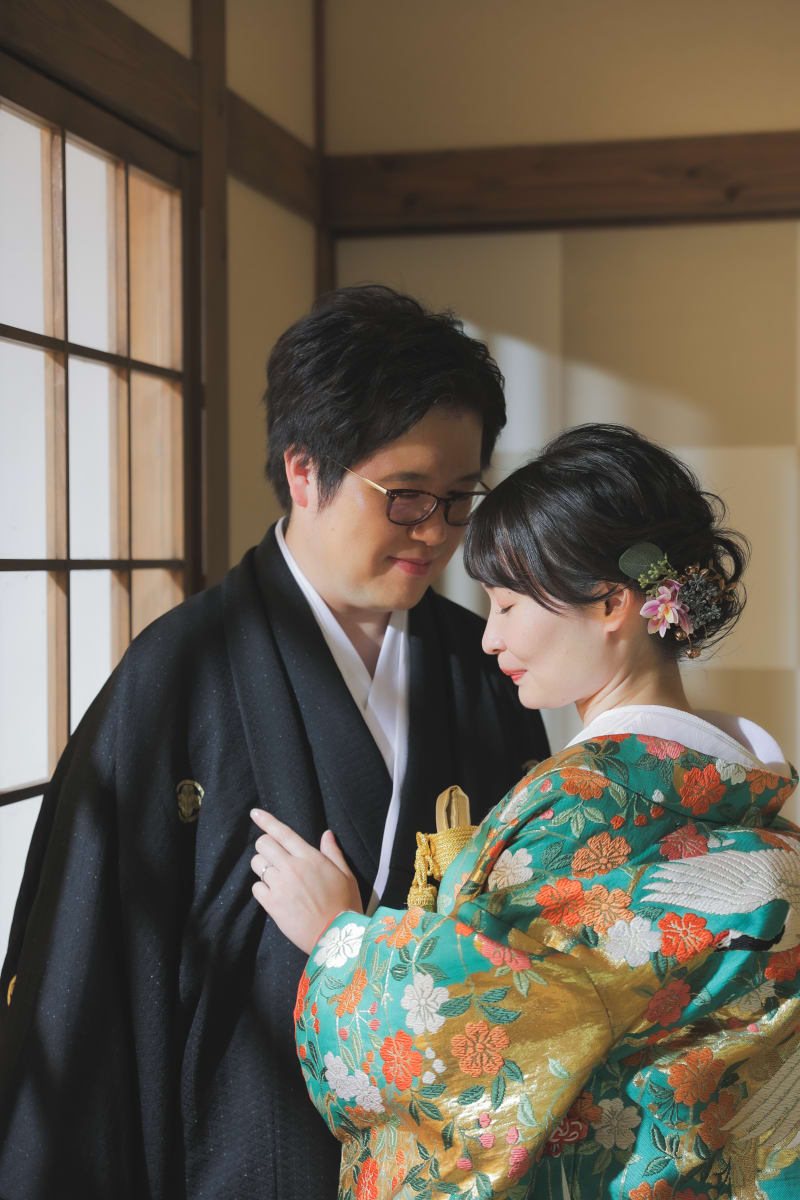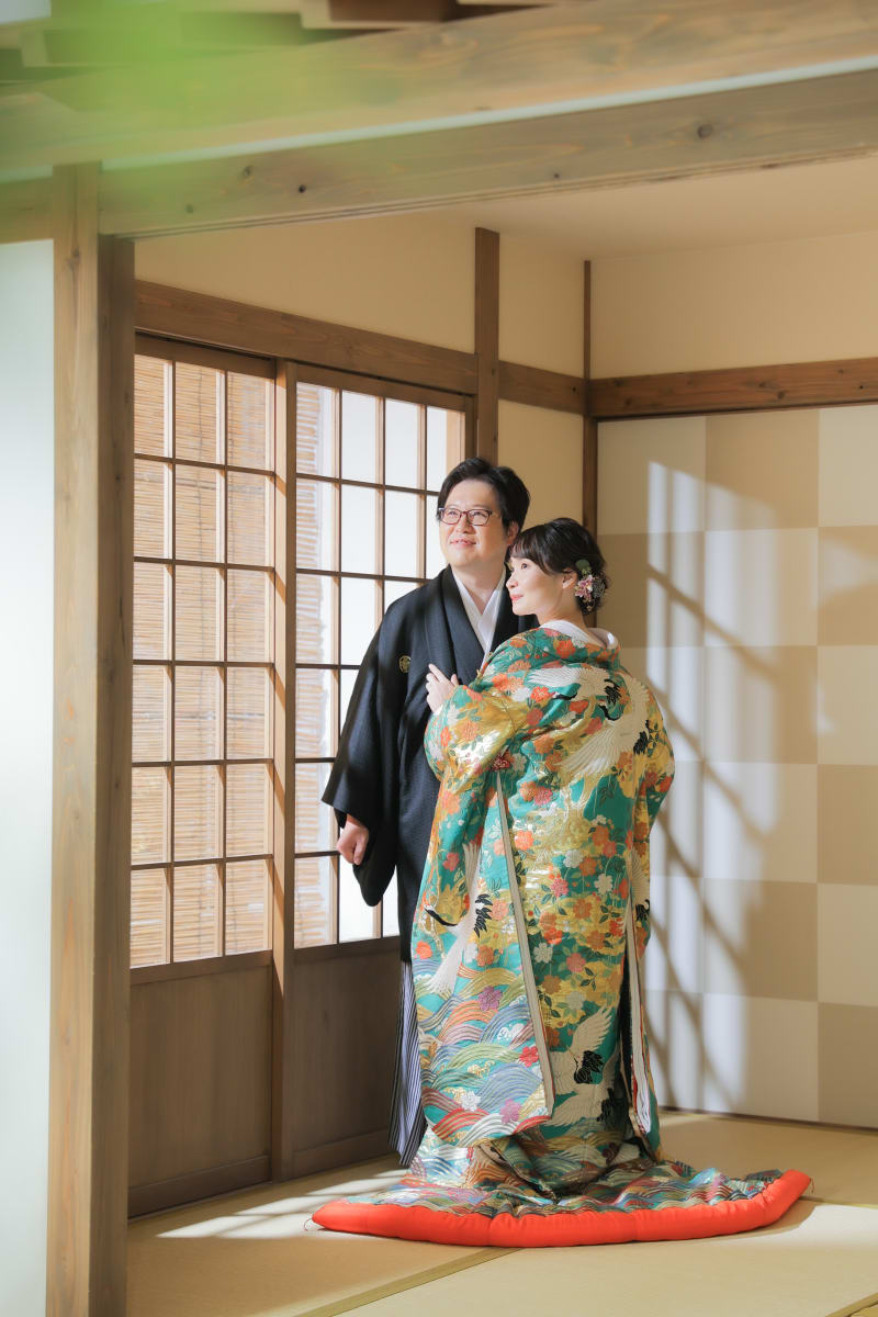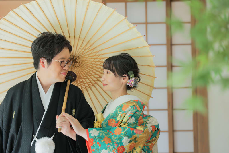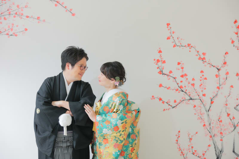 縁側を背にお庭で和傘を持ったり、梅の絵が描かれている背景などもありシンプルなお写真も撮れます!