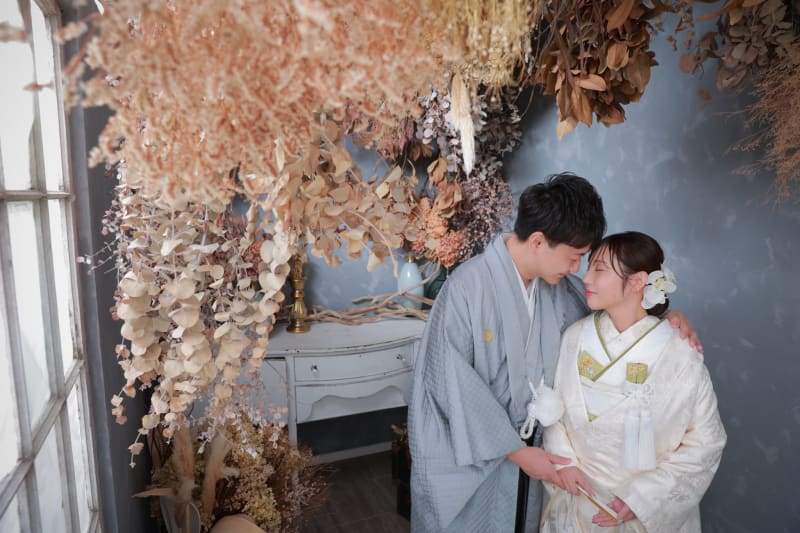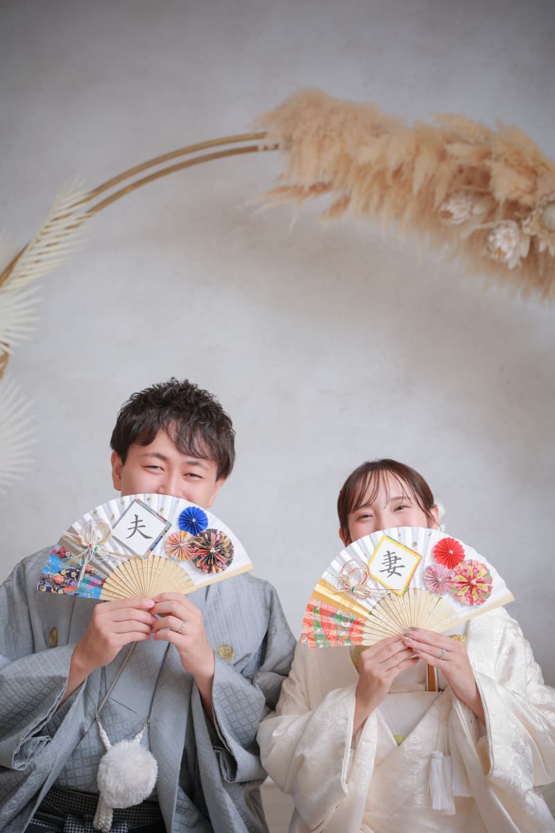 当店にある小物やセットを使用しての撮影や、おふたりお持ち込みのアイテム、扇子やドーナツなどを使用して撮影していきました!