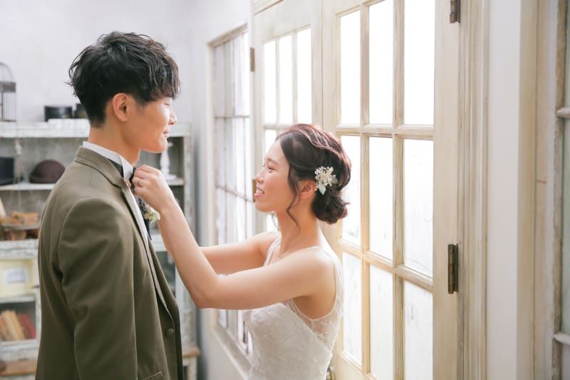 ご新婦様がご新郎様の蝶ネクタイをなおすポーズしていただきました。