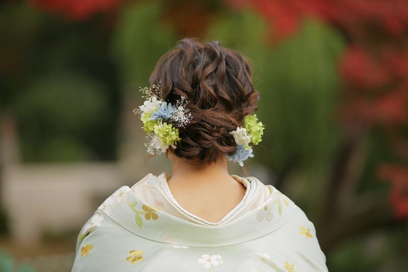ドライフラワーは優しい緑の色打ち掛けに合わせて黄緑や水色のお花をチョイスしました!