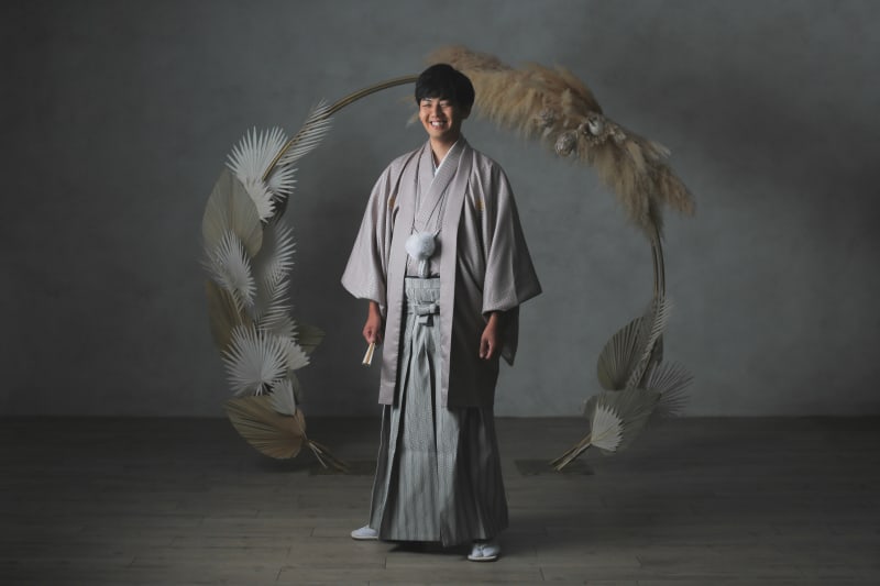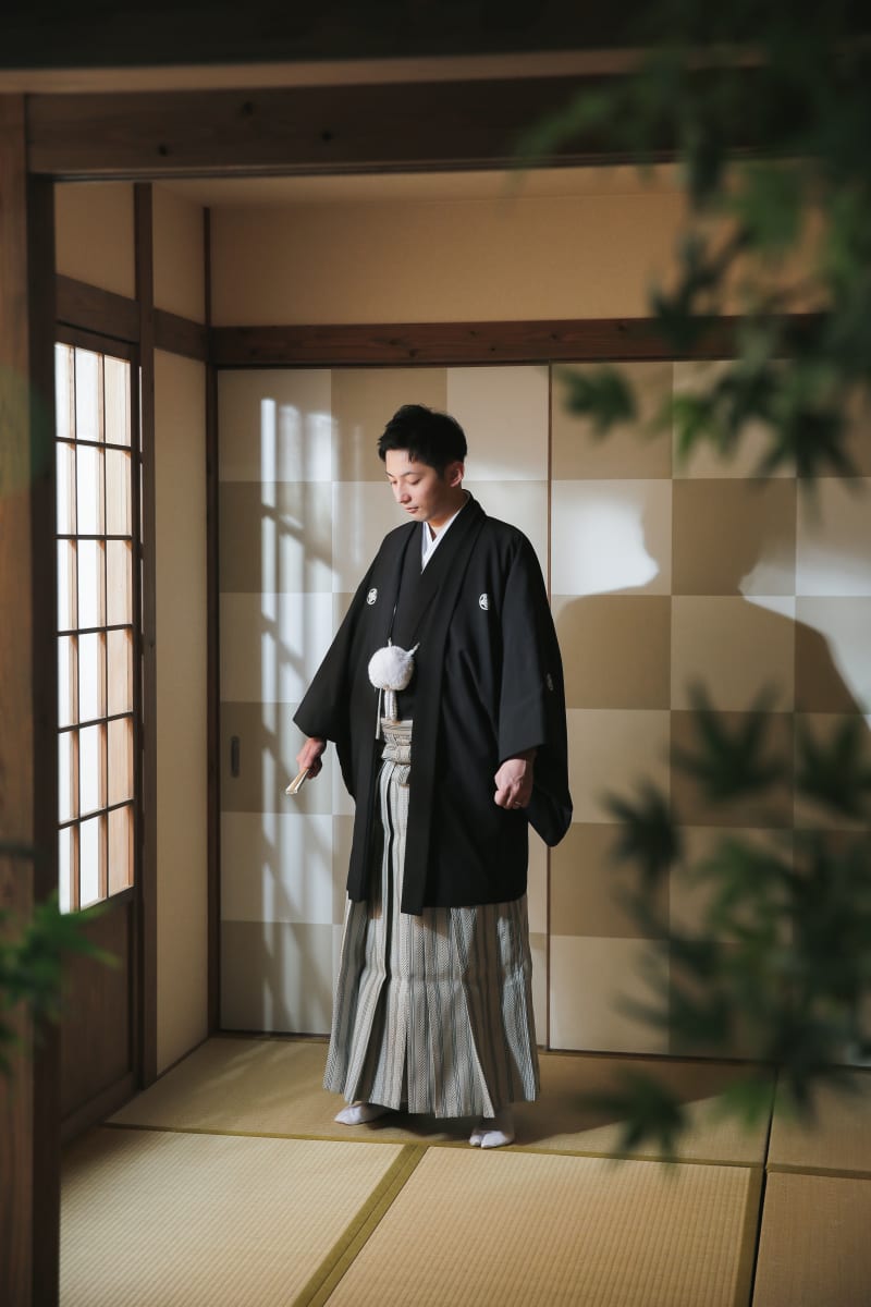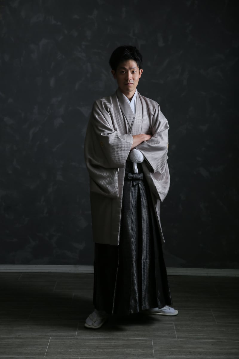 最後の新郎様はベージュの紋付に、黒ダイヤの袴を合わせています。