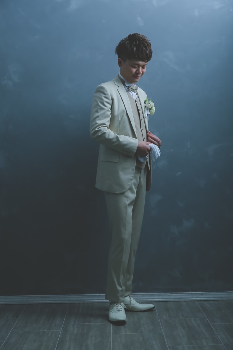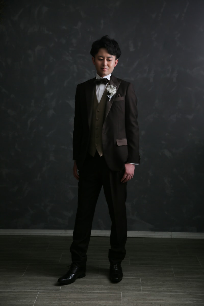 こちらのお衣装は、全体がカーキ色のタキシードです。
