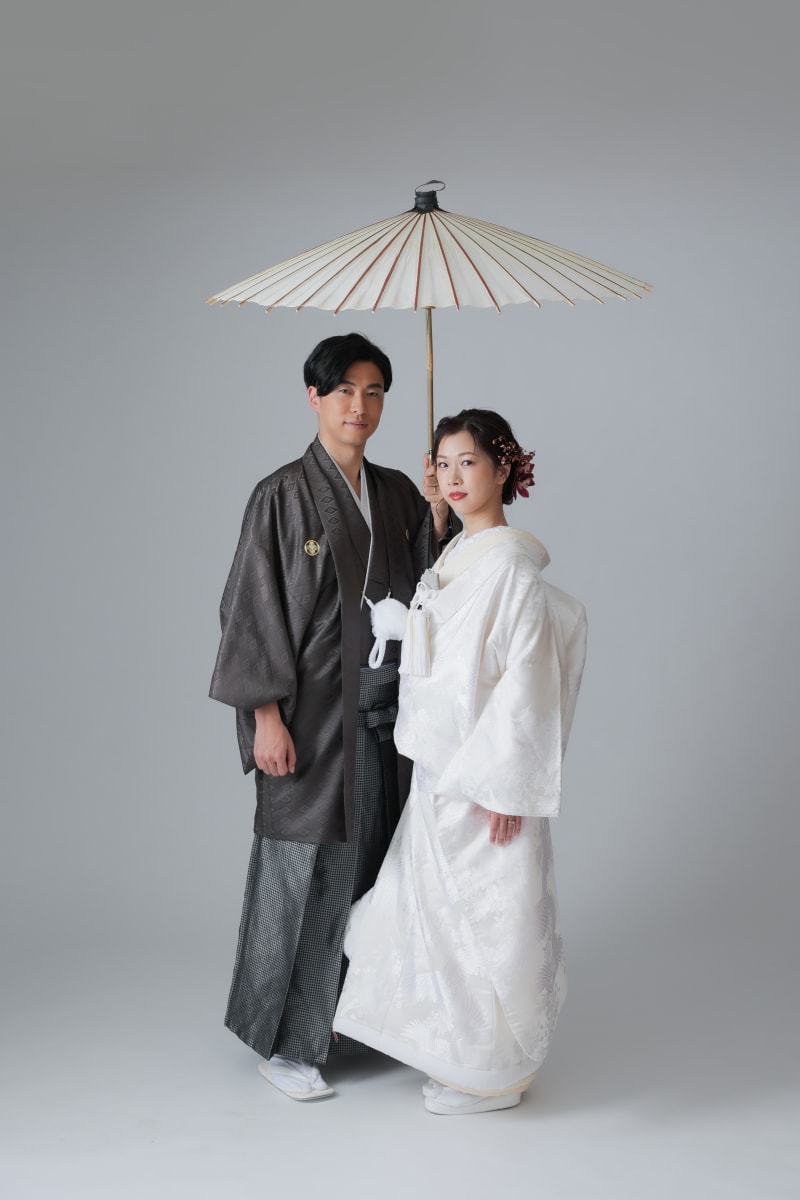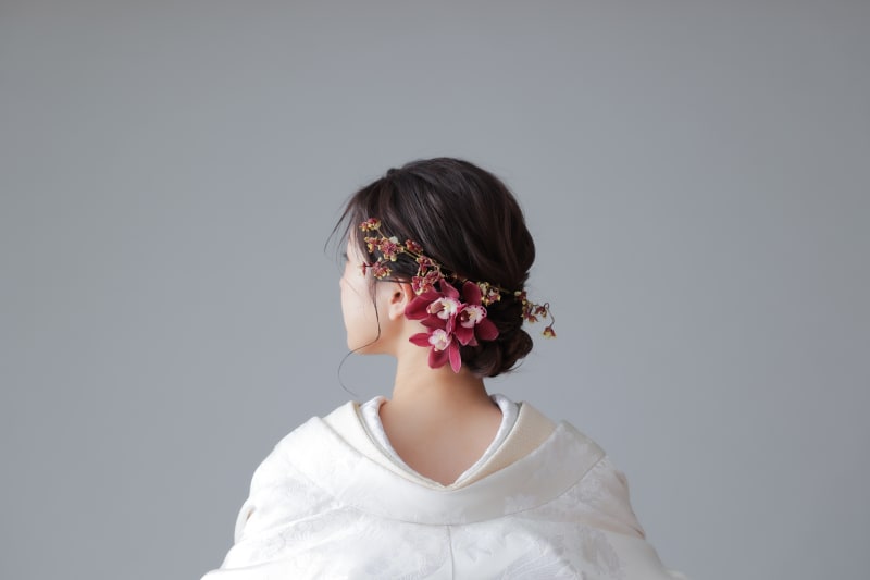 ブーケやヘッドアクセサリー全て生花で持ち込みです。本当にセンスが良すぎました♪衣装も白無垢背景もシンプルだったのでカラーものがすごく映えました♪可愛すぎました!!!