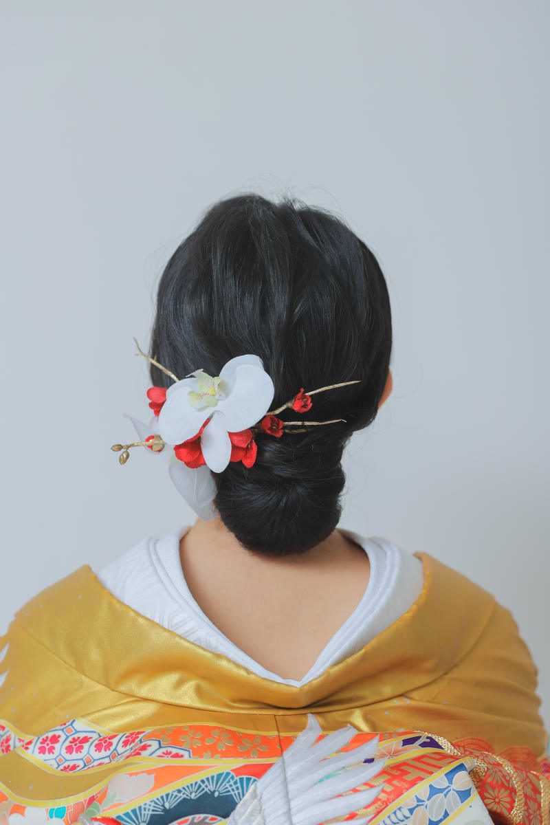 お着物のコーディネートに合わせて髪飾りは差し色で『赤』を取り入れてみました。
