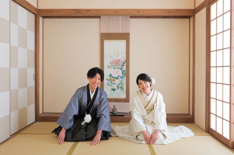 本格的な茶室スタジオで撮影する、和装の結婚写真