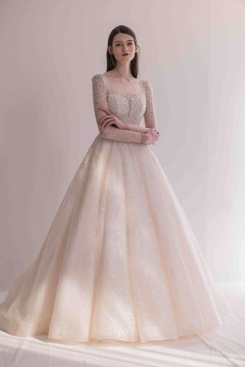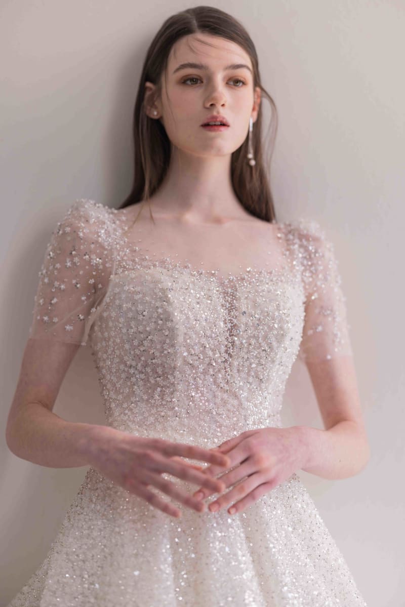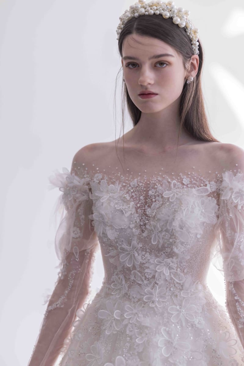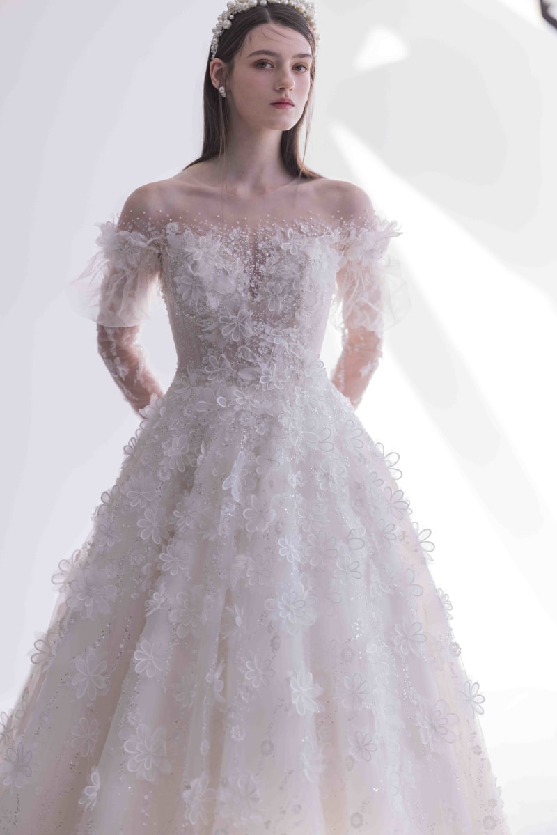 ドレス全体に施された3Dフラワーと ビージングが揺れるたびに煌めき、柔らかな素材と相まって可憐でドラマ ティックな花嫁を演出します。