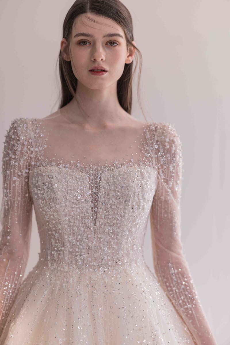 ドレス全体に施されたビーディングが動くたびに煌びやかな